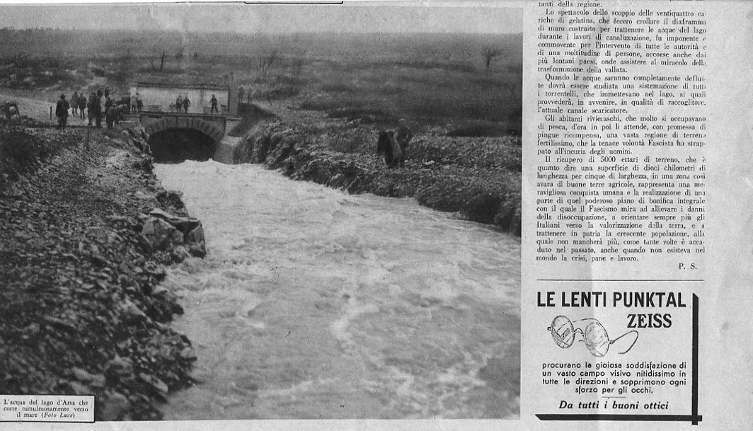Veličanstveni posao - naslov je teksta o isušivanju Čepićkog jezera, koji je u veljači 1933. godine objavljen u ilustriranom časopisu fašističke stranke Italije Gente nostra (Naši ljudi). U članku se, uz nezaobilaznu slavu novog poretka i Duccea, navodi da je taj ogroman posao samo jedan od niza radova obavljenih u proteklih desetak godina u Istri, koja doživljava preporod nakon vraćanja u krilo matice domovine. Uz to se spominje da je Čepićko jezero bilo najveće u Julijskoj krajini, da je zahvaćalo 18 milijuna prostornih metara vode i da je njegovim isušivanjem i uređenjem sliva rijeke Raše Domovini predano oko 5000 hektara toliko potrebne poljoprivredne zemlje. Radovi su započeli 14. veljače 1928. godine, da bi završili su 11. prosinca 1932. godine.